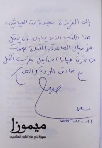 “إلى العزيزة سعيدة بنت العياشي التي وجدت الطريق إلى الشعر في ذاتي خلال سنوات الدجى السوداء. كلامك على كل ذلك ترك أثره في نفسي. شكراً على تضامنك الإنساني.”